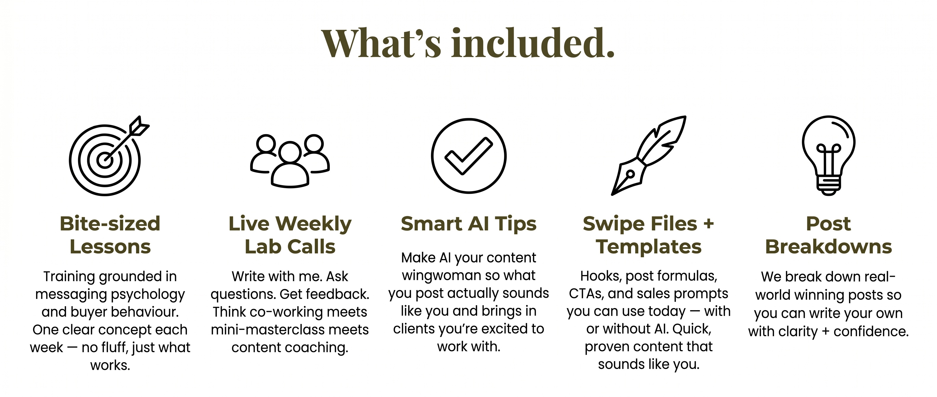 It’s ideal for business owners who want to improve their messaging, create content more consistently and market their services without feeling overwhelmed or sounding overly salesy.